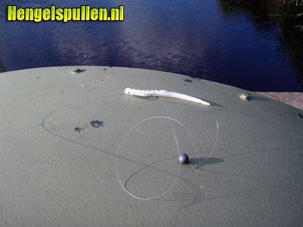 Een dropshotmontage fabriceren is kinderwerk. Maar het juiste materiaal en de juiste afstemming, dat is een ander verhaal. Met de Melissa van Spro, voorzien van 0.10 dyneema kun je veel kanten op. Es even kijken, ah, hebbes, fluorcarbon, dat komt mooi van pas voor de onderlijn. Even de armen strekken en het stuk dat tussen de beide duimen en wijsvingers zat afknippen. Dan nog even een haak monteren met een wijde bocht. De Palomar-knoop (zie tekening), hoe ging die ook alweer, o ja, twee keer oefenen en je vergeet hem voorlopig niet weer. Tja, en dan de hengel. Nu kun je natuurlijk naar de winkel rennen en een speciaal voor dropshotten ontworpen stok aanschaffen, maar stel dat je zegt, 'aardig hoor, maar het is niet helemaal mijn ding!' Weer een hengel in het rek die meestentijds werkeloos staat te wezen. En een paar tientjes lichter. Kijk loodjes in verschillende gewichtsklassen dat kost je de kop niet, maar ik wilde het verschijnsel 'zonde geld' voorkomen. Mijn Ron Thompson, een spinstok uit de gewichtsklasse 5-20 gram, met een zeer meegaande actie leek me misschien niet bij uitstek, maar zeker om de techniek onder de knie te krijgen en ervaring op te doen prima geschikt. En alleen in de praktijk kom je er achter wat het meest geschikt is voor het water waar je op vist, en dan nog, vissen is zo persoonlijk. De een vindt de actie geschikt, een ander te slap. De een kiest voor donkergroen, de ander voor knalgeel. Het blijft een speurtocht, naar het juiste gewicht, shad of worm, de kleur daarvan en de afstand tussen het aas en het lood. 'Wat denk jij', vroeg ik mijn vismaat. 'Nu zit je goed', zei deze ervaren hengelaar op een gegeven moment. Even later ging ik toch voor iets lichter. 'Dan voel je amper wat er gebeurt', wierp hij tegen. 'Kwestie van concentratie', vond ik. Zo zie je maar. Het was zoeken naar de in mijn ogen juiste combi. Groot voordeel is het veel, echt veel minder vastzitten dat tijdens het traditionele diagonalen en verticalen. Niet zo gek natuurlijk met die grotendeels in de worm verstopte haak en de aaspresentatie boven de bodem (zie illustratie).