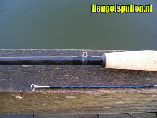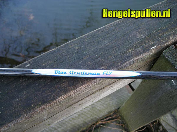 Er zitten in totaal negen ogen op de hengel plus een verkasoogje boven de handgreep. Het startoog is gevoerd en de overige ogen, behalve het topoog uiteraard, zijn slangenogen. De reelhouder is van kunststof en hoewel dat natuurlijk uitstekend functioneert, vind ik dat altijd jammer. Functie is uiteraard het belangrijkst, maar het oog wil ook wat. Het is een uplocked reelhouder Op de hengel zijn, in bescheiden letters, het merk, type, hengellengte en aftmaklasse aangegeven. Daarnaast zit er een grote sticker op de hengel, met daarop het hengeltype 'Blue Gentleman FLY', maar die heb ik er, voordat ik ermee aan de slag ging afgehaald, want ik hou helemaal niet van overbodige versieringen of neonletterachtige aankondigingen op een hengel. Ook de, op iedere nieuwe carbon hengel terugkerende, waarschuwing voor onweer en elektriciteitsmasten heb ik verwijderd. De hengel is glanzend antraciet en daar overheen ligt, kruislings geweven, een patroon van om en om zwarte en blauwe lijnen. Het blauw valt overigens nauwelijks op, men moet het echt van dichtbij bekijken, maar het ziet er fraai uit.