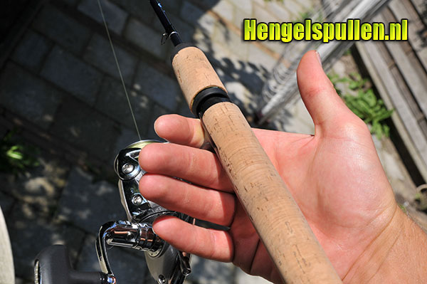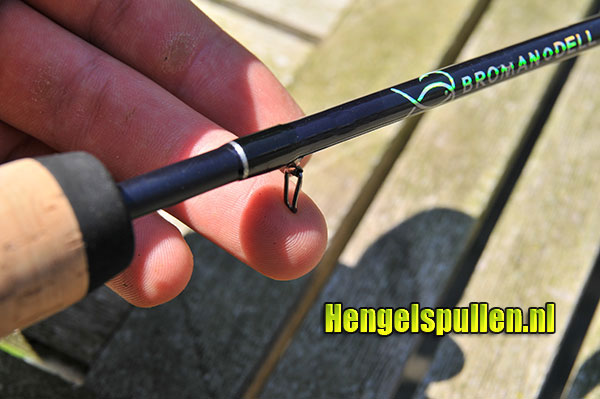 Deze hengel van Bromanodell is een "lekker mooi hengeltje". Door de mooie lak en de nauwkeurig geplaatste SIC geleideogen, heb je echt een plaatje in handen. De insteeksluiting ziet er netjes uit en sluit goed. Wel dien je de 2 delen goed in elkaar te schuiven om te voorkomen dat je tijdens een harde worp de hengel uit elkaar gooit. De molen zit met een draaibaar kurken handvat (screwdown cork) op de hengel gemonteerd. Hiermee is prima te vissen en je hebt lekker veel kurk onder je handen. Opvallend detail is dat de eindknop ook van kurk is. De hengel is ook voorzien van een haakoogje. Zelf heb ik hier geen gebruik van gemaakt. Sommige van mijn hengels hebben niet een dergelijk oogje, ik ben er dus aan gewend om de haak in ''n van de SIC-geleideogen te hangen.