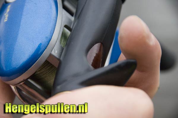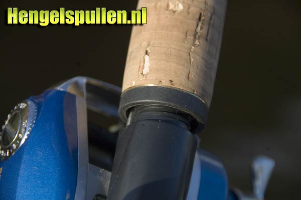 De Daiwa Viento reel zit door een schroefmechanisme zonder speling muurvast op het handvat gemonteerd.