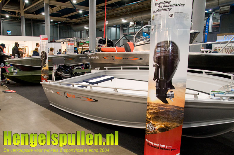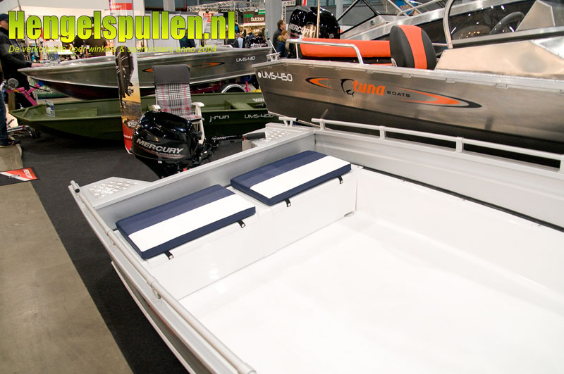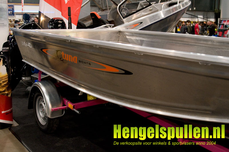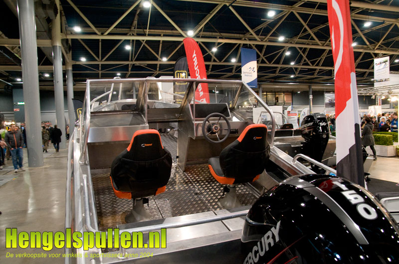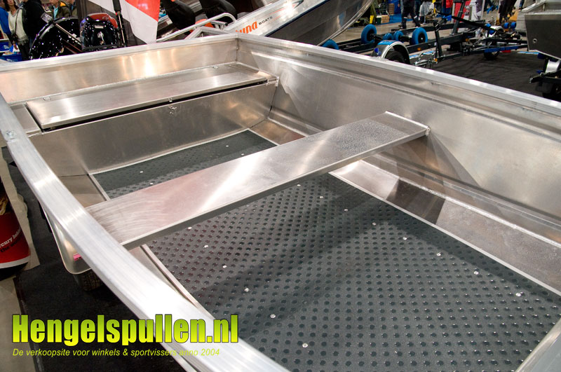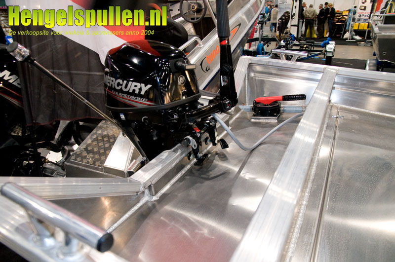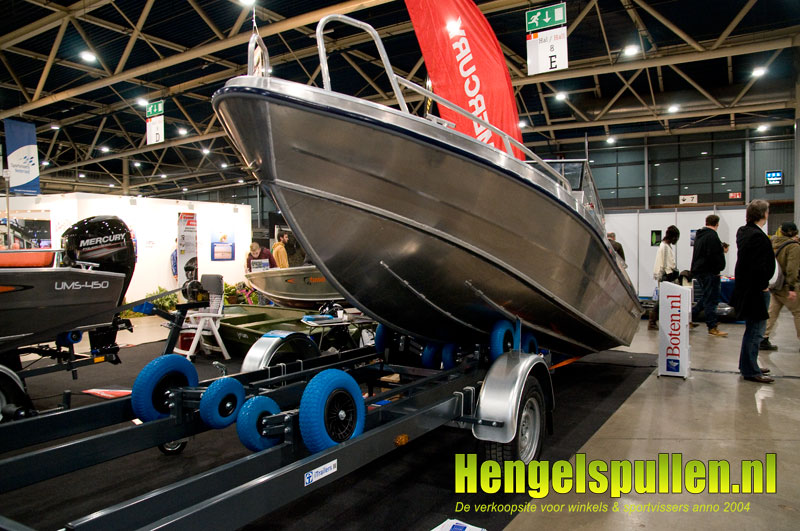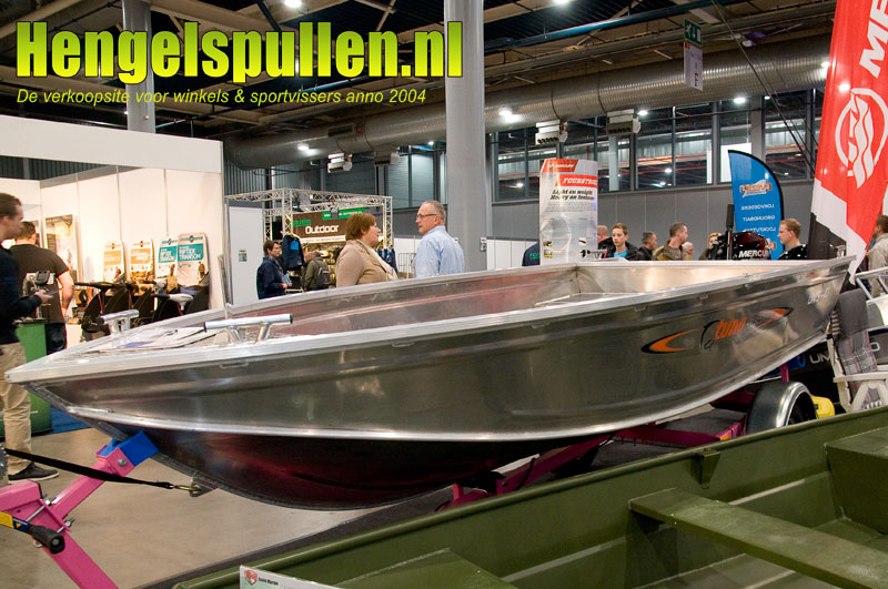 Bij het bezoek aan de hengelsportbeurs in Utrecht viel mij meteen het grote aantal boten op. Je loopt er langs en wilt er eigenlijk niet naar kijken, noem het zelfbescherming. Totdat mijn oog viel op een robuuste boot gemaakt van gelast aluminium, met een mooie boeg en een strakke lijn. Toch maar even vragen. Wat bleek, de boot was gemaakt van 3mm aluminium en je kunt er maar liefst 30pk achter hangen. Oei, dat klinkt goed! Ook een inspectie van de binnenkant van de boot deed mij positief verbazen. De bodem en de inrichting zagen er degelijk en handig uit. En last but not least, je kunt met de boot het ruwe water trotseren doordat de boot voor CE category C is ontworpen. Bij categorie C gaat het om significante golven van 0,5 ' 2 meter en tot en met windkracht zes. Iets wat ik miste aan mijn V12, die toch echt specifiek is ontwikkeld voor slootjes en kleine plassen met niet teveel golfslag (Categorie D). Ook is deze boot 10cm breder dan mijn V12, wat er lekker stabiel uitziet. Je kunt er prima staand in vissen volgens de verkoper. En om eerlijk te zijn, ziet de boot er ook zo uit. De prijs van deze boot ligt rond de 3750 euro.