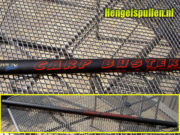 De Carp Buster, een powerhengel ten voeten uit. De 9,5 mtr lange (inclusief extension ca. 10,5 mtr.) oversteekhengel is hierdoor meteen een van de langere in zijn soort. Hij is gemaakt uit hoog modulair carbon en heeft verstevigde bussen. De hengel is soepel en kent een mooie actie tot in het handdeel. Dit alles echter zonder slap te worden . Door de toegepaste balance factor, is het zwaartepunt van deze hengel zorgvuldig bepaald. Het perfect gekozen zwaartepunt in combinatie met de relatief dunne diameter en een gewicht van slechts 478 gram, maken deze hengel tot een lat waar langere tijd goed mee vanuit de hand kan worden gevist. De eind diameter van de top heeft JVS opvallend groot gehouden. Bij elastiekmontage zal dan ook weinig tot niets van de top hoeven te worden afgesneden. De extension, veelal bedoeld ter compensatie van het verlies aan lengte bij de top (vanwege de elastiekmontage), betekend bij deze hengel dus ca. 1 meter extra hengelgenot. De Carp Buster is een karperhengel bij uitstek, gemaakt voor het zwaardere werk. Deze hengel kan echter ook goed worden ingezet bij het vissen op zeelt en grote brasem. Het is een hengel welke uitermate geschikt is voor de tegenwoordig steeds vaker voorkomende karper- en brasemvijvers.