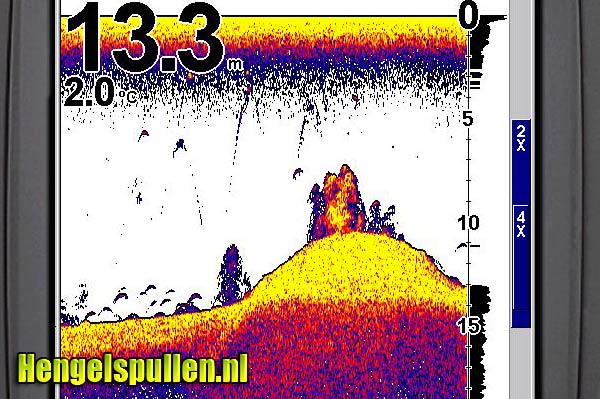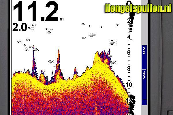 Je ziet naast het bodemverloop de snelheid waarmee je vaart en de watertemperatuur. De maantjes op het scherm zijn vissen.