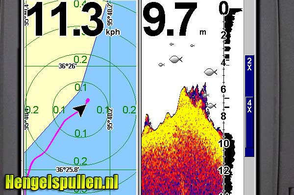 GPS (links) en Sonar(rechts) op 1 duidelijk beeldscherm in 256 kleuren.