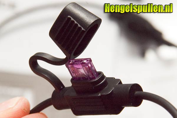 De zekering plaats je op de 2 rode (poitieve) draden.