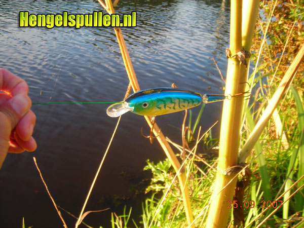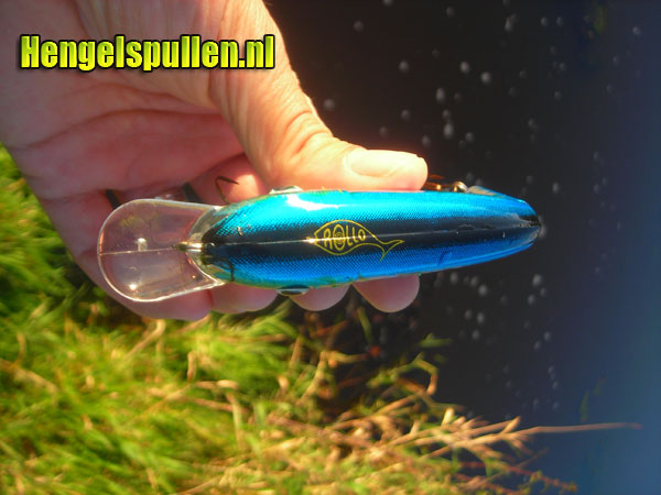 Of ik mijn medicijnen wel geslikt had, wilde mijn vismaat weten. Even daarvoor had ik gezegd dit nieuwe aasje zonder onderlijn te vissen, omdat volgens mij dan de actie beter tot uiting kwam. 'Volgens mij is de vis dan minder achterdochtig', voegde ik er quasi onschuldig en licht provocerend aan toe. 'Je bent niet wijs', begon ie iets meer achter uit de keel. 'Zelfs dyneema is niet bestand tegen snoektanden. Straks meldt zich een jetzer en verspeel je 'm dankzij je eigen dommigheid. En dat is allemaal tot daar aan toe, maar straks zwemt hier een snoek rond met een plug aan zijn snuit!' Tijd om 'm uit de waan te halen. 'Kijk es', zei ik en trok het aasje een eind achteruit, waarop het staaldraadje zich manifesteerde. 'Kolere', riep ie vol verbazing, 'een plug met een rolfluit!' Mijn maat heeft grote handen, nam in de ene kolenschep de plug en begon hard aan het oogje te trekken. Hmmm, zit goed vast, geen slappe hap. De Rollo Minnow is een crankbait (ontworpen om in ''n tempo te worden binnengehaald), met een voor een tweedelige plug typerende slangachtige actie. Alle varianten gaan tot zo'n 1,5 ' 2 meter diep en zijn derhalve geschikt om de kanalen, sloten en weteringen mee af te struinen, maar achter de boot levert dit aasje van hardplastic ook prima arbeid, gevist met een redelijk strak medium spinhengeltje gebouwd voor aasjes tussen de 15 en 30 gram. Het leadertje zit dermate strak opgebonden, dat bij het vissen het oogje strak tegen de plug blijft.