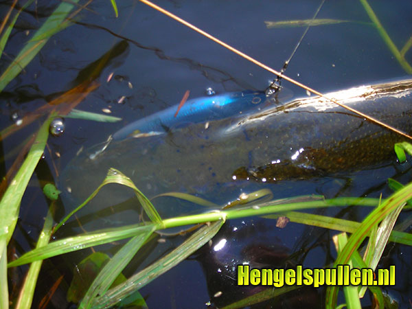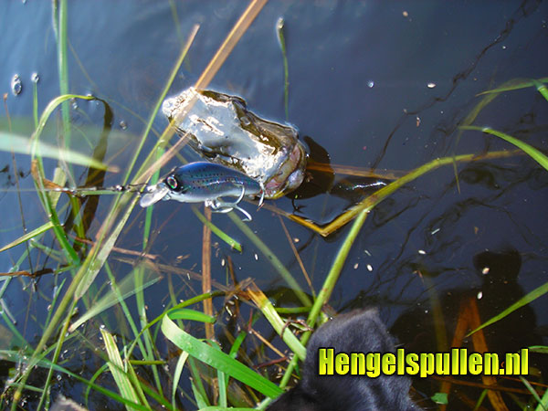 De Live Bait is getest in de gekanaliseerde riviertjes Vecht en Regge. Met een ongeveer manshoge diepgang is dit jachtterrein op het lijf van dit aasje geschreven. Natuurlijk is het aan de kant ondieper, welnu, korter bij de kant wat trager inhalen en het gevalletje stijgt langzaam naar de oppervlakte, een kwestie van vissen met beleid derhalve. De plug heeft een wijde uitslaande actie, mooi, maar niet uniek, waarover meer in het laatste hoofdstuk 'Conclusie'. 'Bij helder weer en water komt dit prismaatje met haken je tegemoet schitteren en als het mij opvalt, dan geldt dat zeer zeker voor die gespikkelde jongens met hun kinnebak. Ha, ha, kom maar op jongens, 'tease me, tease me, tease me, tease me baby, till I loose control', wham, hoppa, hebbes, ik zag het al voor me! Aan de Wizard Spin van Ron Thompson (zie review in eerder stadium), die, zo verraadt de stok, een gewicht tot 25 gram verantwoord kan verwerken is dit aasje toch prima te vissen, maar, o, maar, hoewel slechts lichtelijk overbelast, betaalde ik leergeld. Vangen schept vertrouwen, dus toen de eerste snoek zich meldde, had ik echt iets van 'en dat is ''n' en wilde snel door naar twee, liefst een wat grotere tante dan deze jonge deerne van 69 centimeter in lengte. Overmoedig zette ik een tijdje later in voor de volgende worp, hoorde een korte tik en zag de Live Bait inclusief onderlijn, shit, ook nog van titanium, met een grote boog stroomafwaarts verdwijnen. Tjonge jonge wat balen zeg, zoiets gebeurt altijd met aasjes waar je het helemaal in ziet zitten. Overbelasting gepaard aan een iets te enthousiast ingezette worp, of een 'rot' plekje in het dyneema, zeg het maar, in ieder geval weg Live Bait en dat na slechts twee uurtjes vissen'
